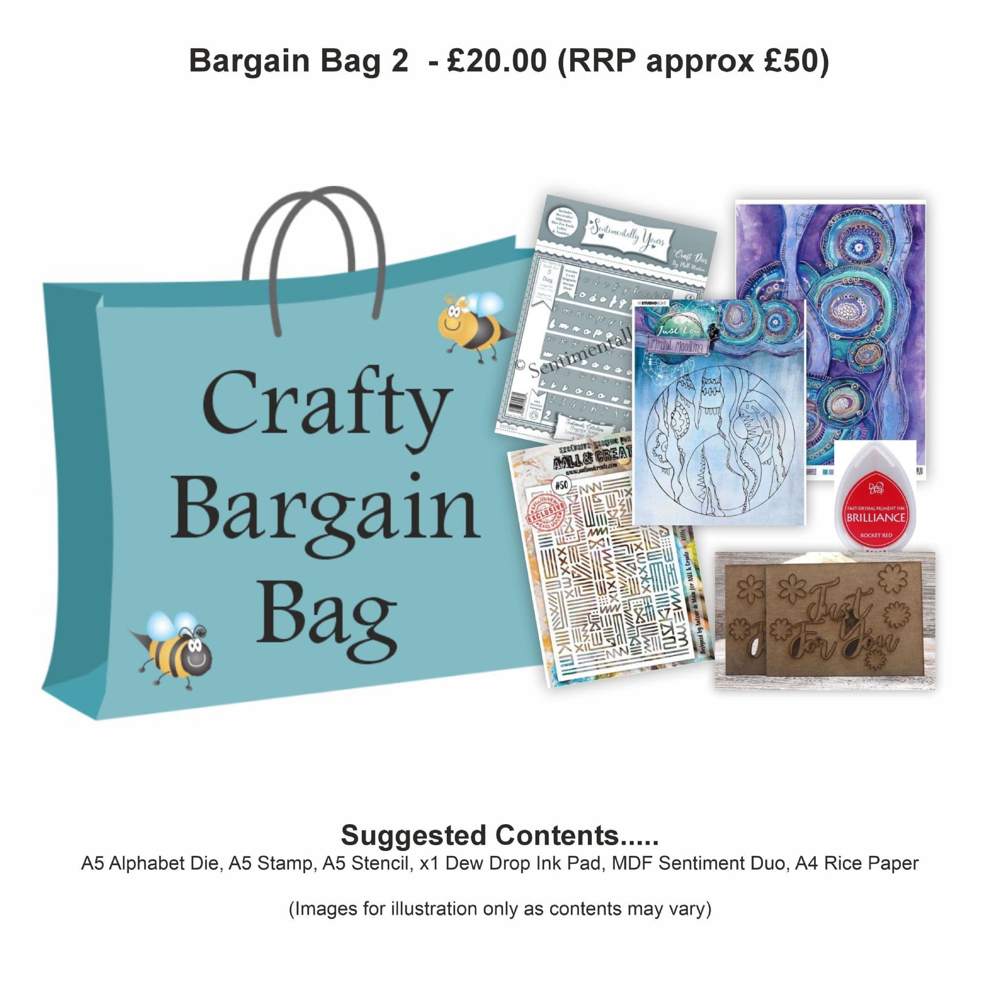 Each bag will contain a selection of items from a variety brands (Sentimentally Yours, AALL, Prima etc) and include at least one stamp, die, stencil and ink pad in each bag.