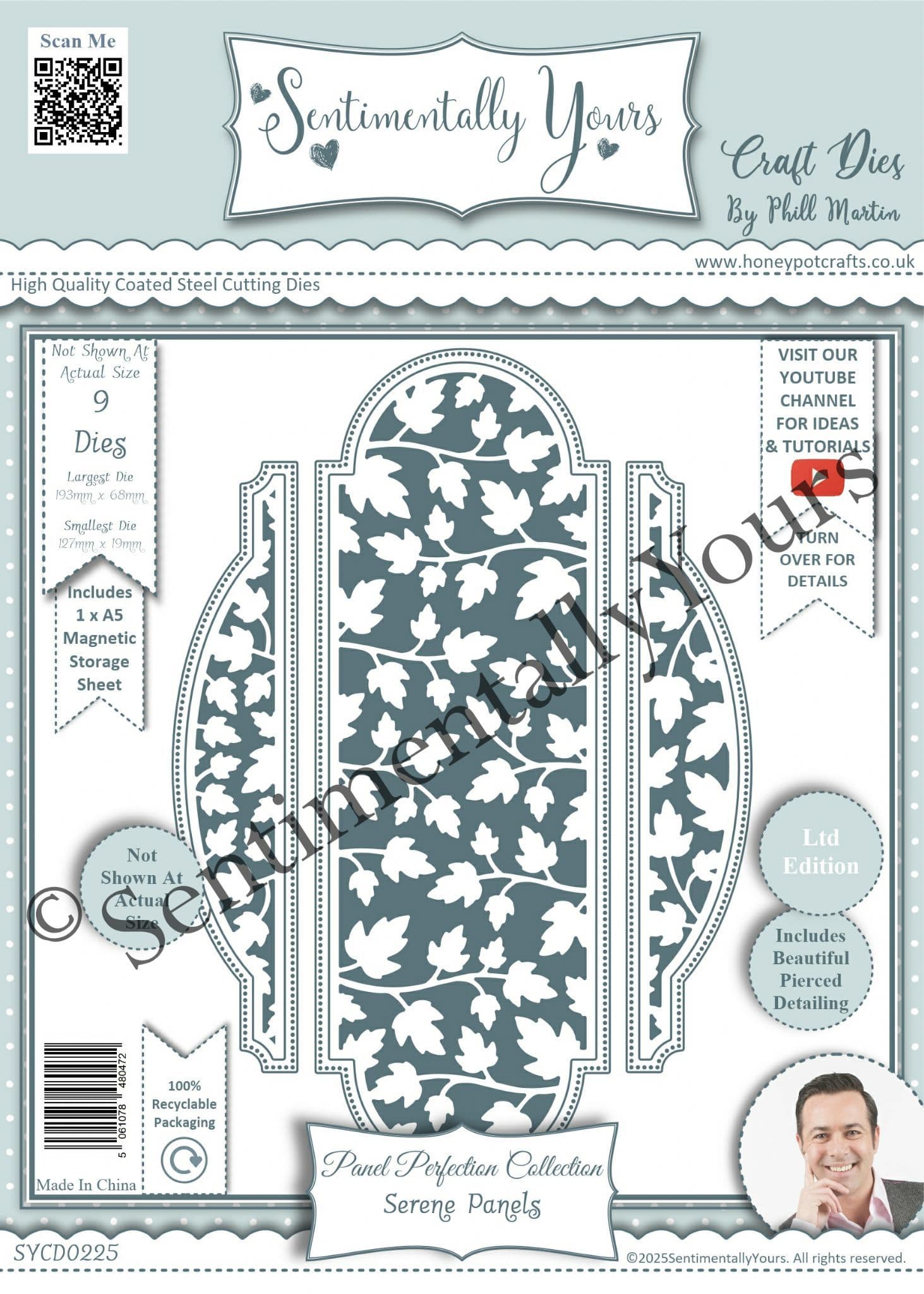 Serene Panels - 1 x A5 Die Set - 12 individual dies plus 1 x A5 magnetic storage sheet. Each of these die sets give you the intricate, panel element, split in to 3 parts AND you also have 2 different, coordinating, styles in the side decorative panel elements, this means you have more than one look for each design as I have designed them so they work on both sides! Then, you also have 3 (yes, 3!) layers for each section and this allows you to use any of them to cut the decorative panels in to or layer them on top of. The largest (outer) dies also have my signature piercing detail on them... so many details.