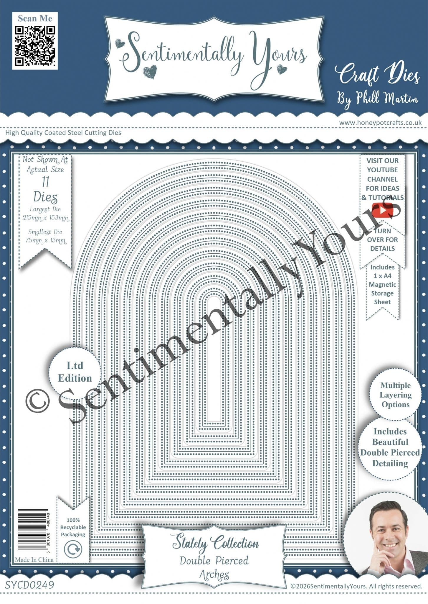 This is the Stately Double Pierced Arches A4 Die Set - 11 Dies including 1 x A4 Magnetic Storage Sheet. Largest die is 215mm x 153mm. Smallest die is 75mm x 13mm.
